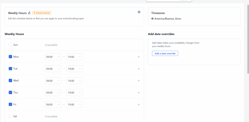 Como buen plugin de reserva, puedes delimitar tus horas laborales, no laborales, y incluso, te toma las de tu calendario de Google Calendar por ejemplo, y te bloquea automáticamente el horario.